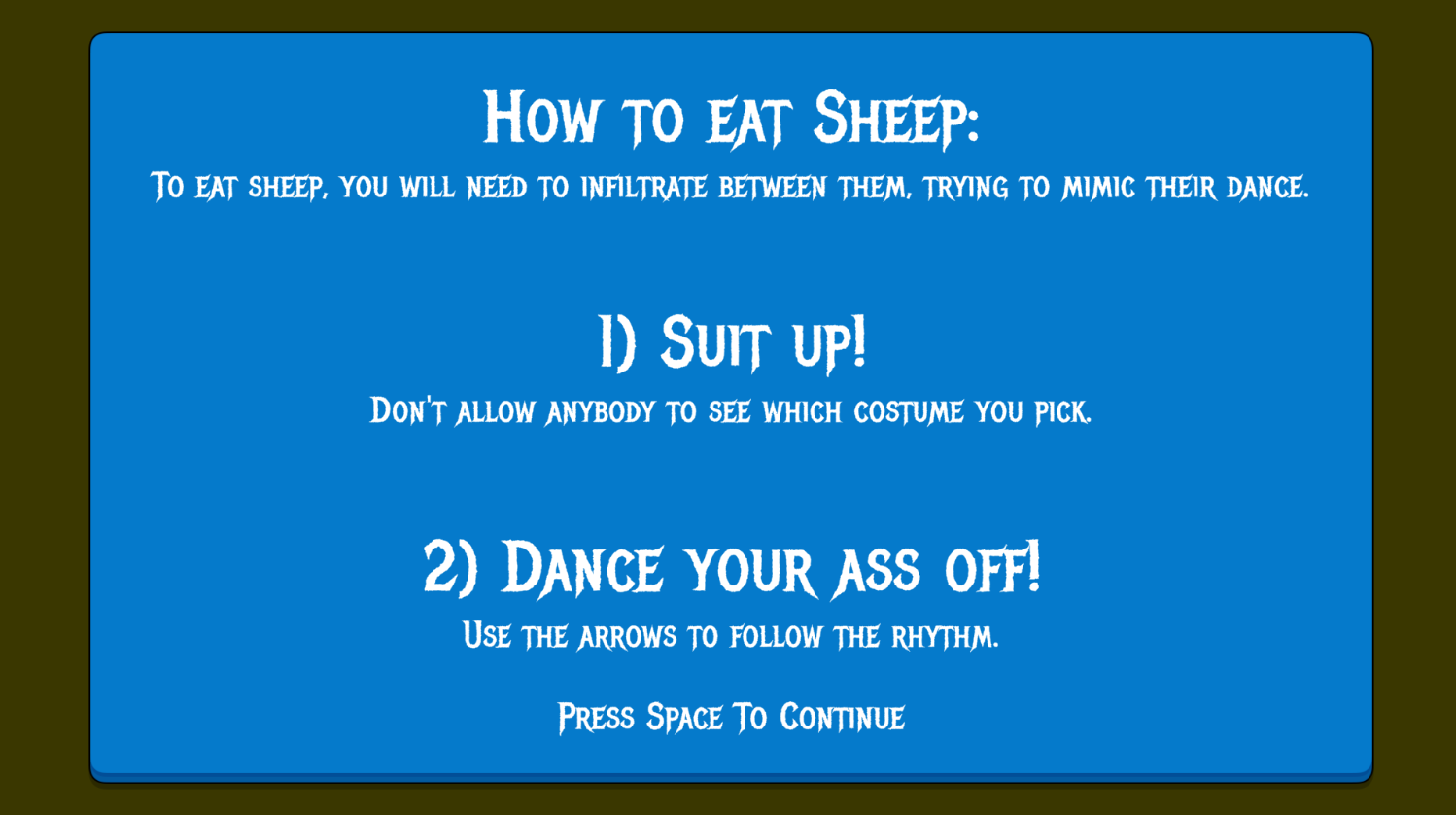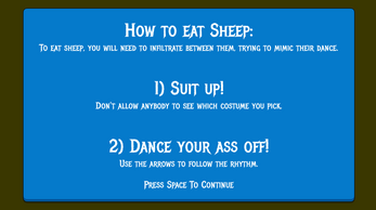 An EPIC battle of the ages between a hungry wold and a grumpy shepherd. Hone your dancing skills to infiltrate the sheep dance floor and remain hidden from the ever watching eyes of the shepherd. Once the party is over, the trigger happy shepherd will eliminate a dancer. Were you groovy enough to pass as a real sheep? The shotgun will decide!